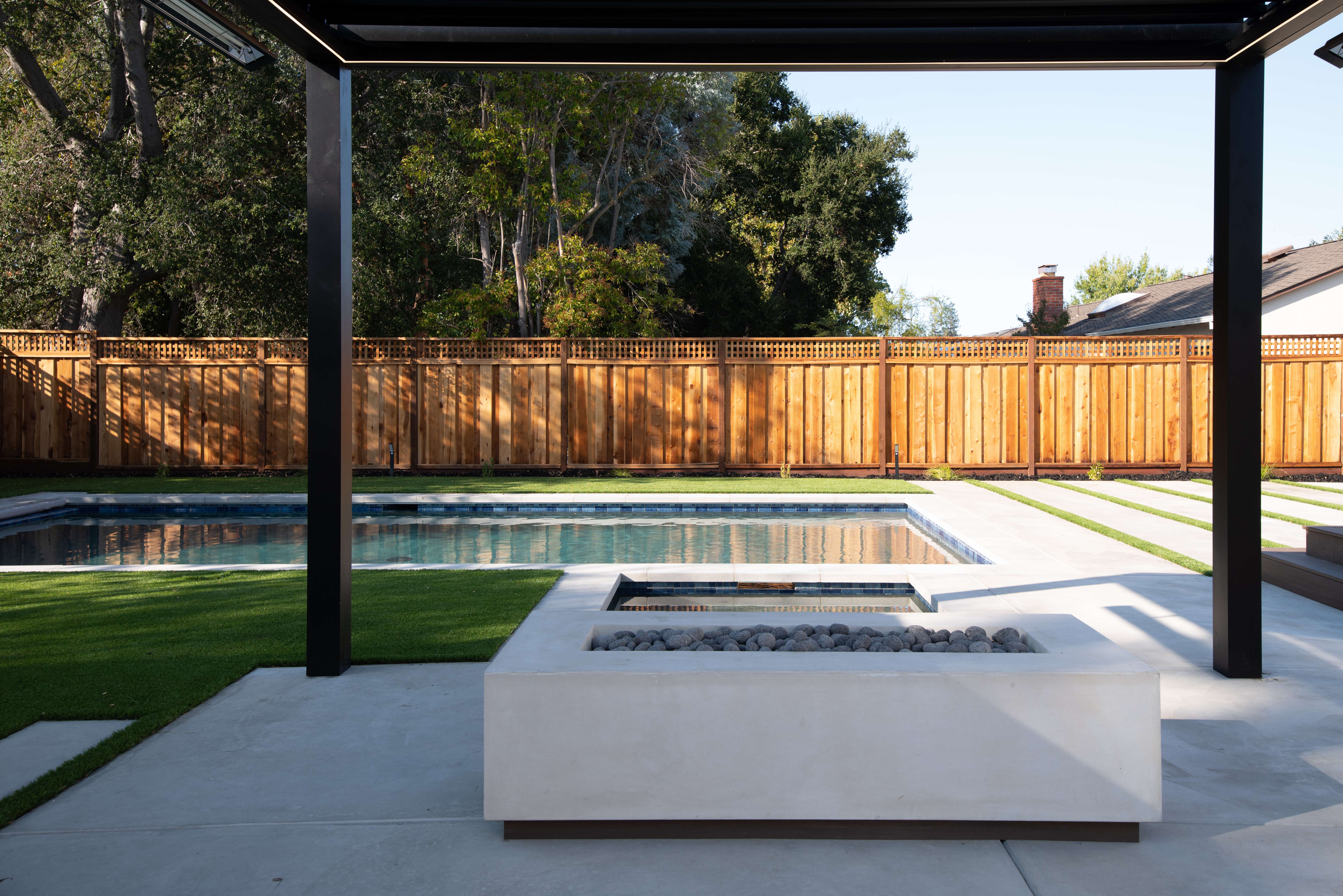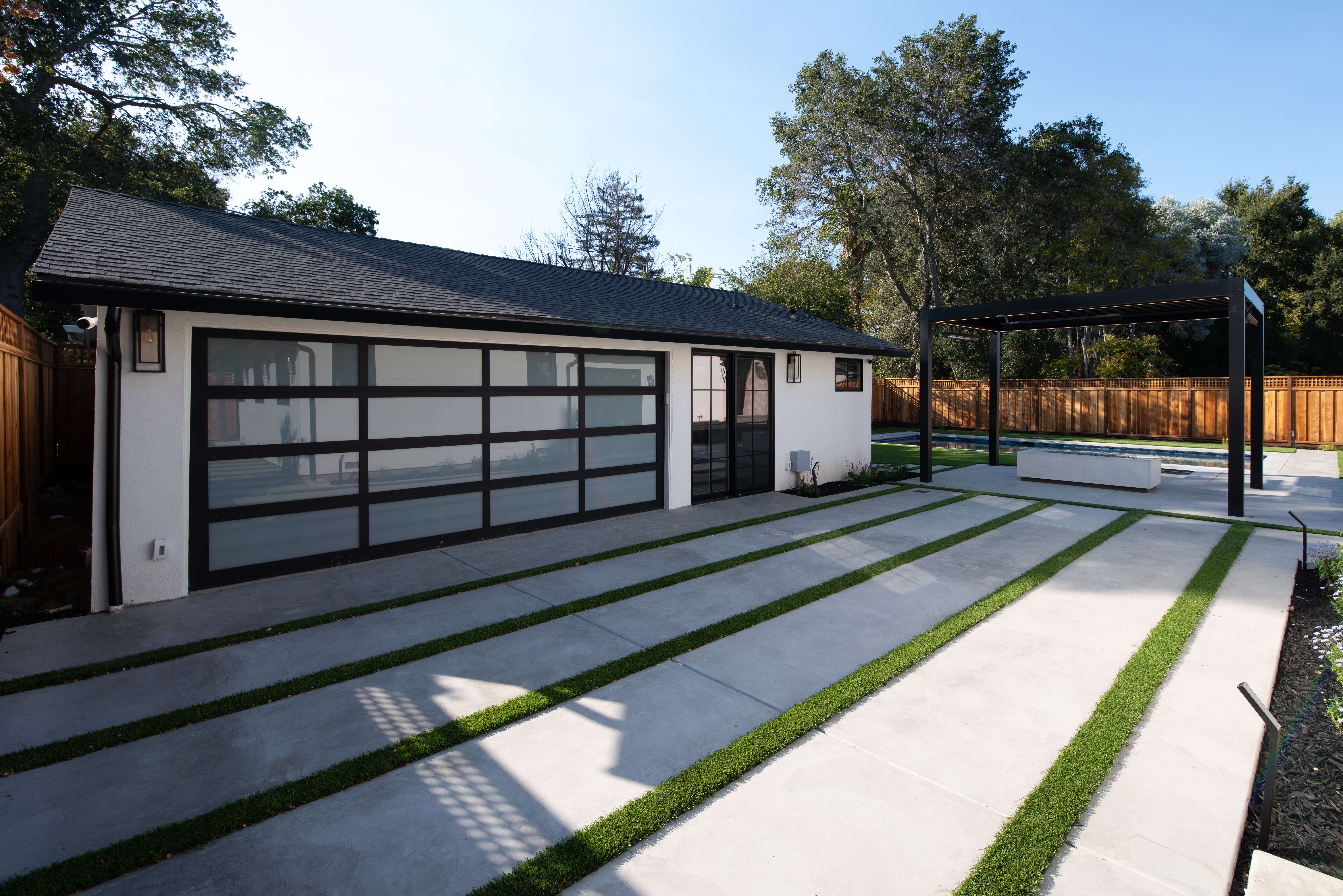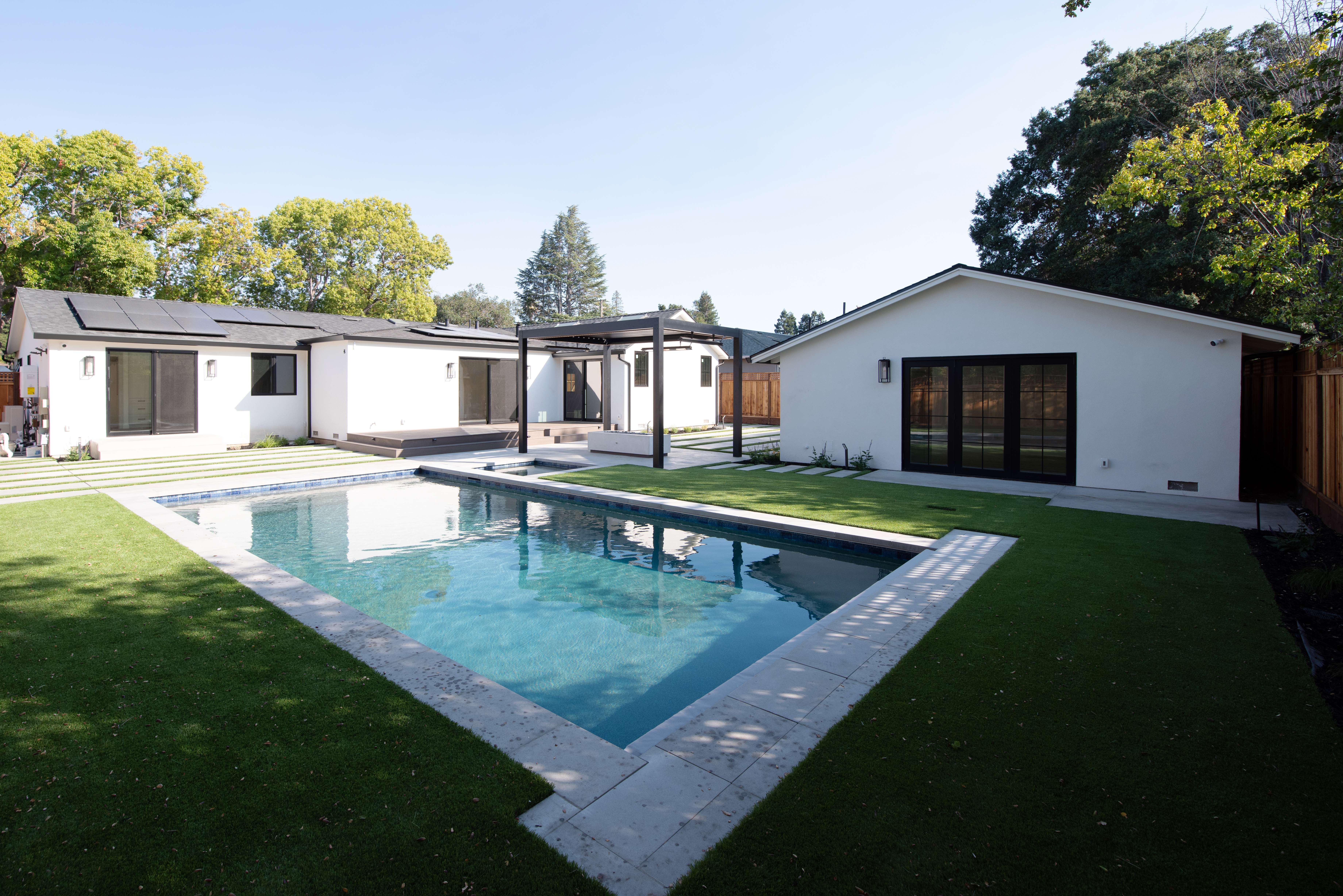 A serene outdoor living space is accentuated with a sleek swimming pool and a stylish pergola, offering a tranquil retreat for relaxation or hosting summer gatherings. This property also includes a versatile ADU (Accessory Dwelling Unit) with a modern garage door front, providing additional space for guests or a home office.