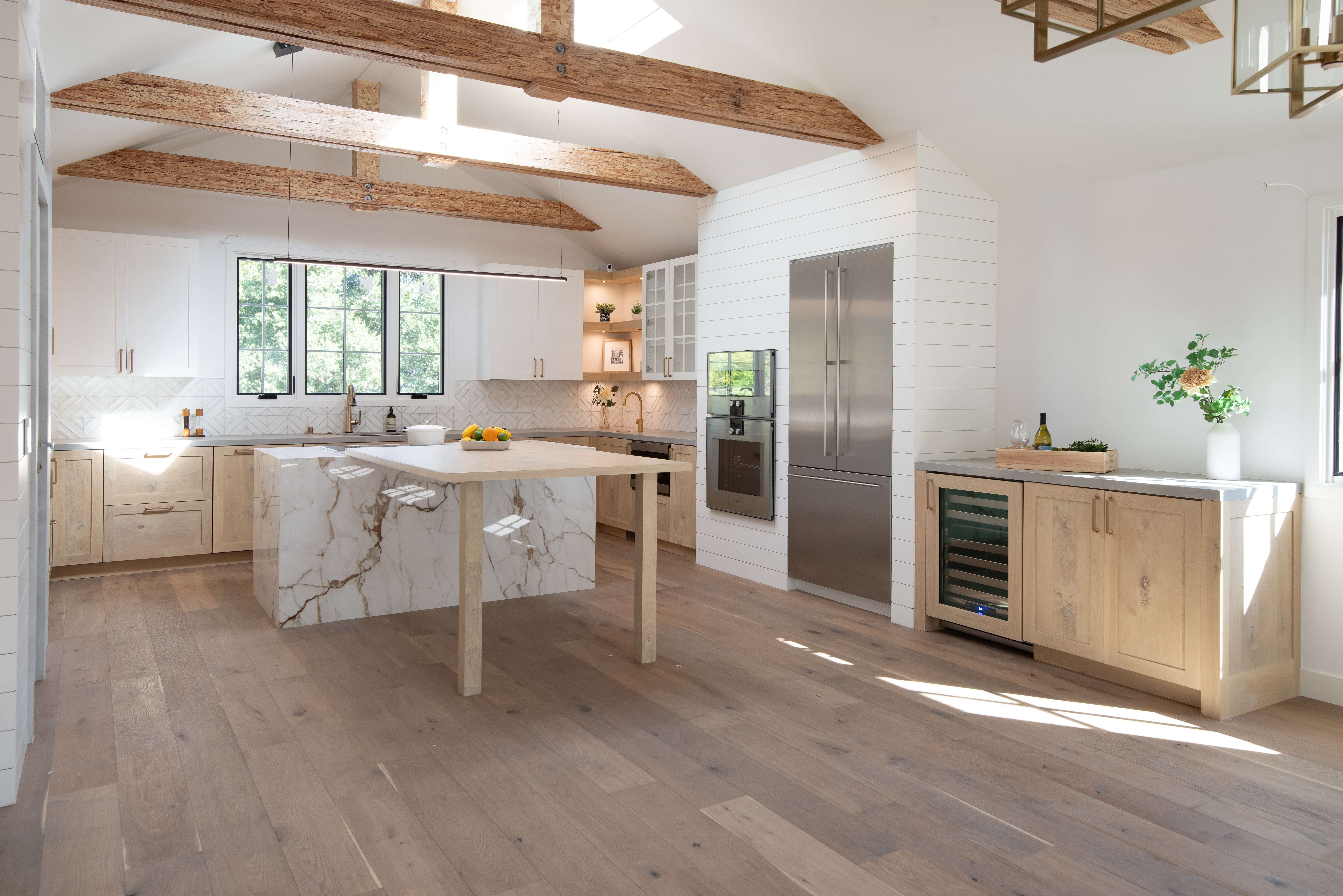 The heart of the home is a state-of-the-art kitchen equipped with high-end appliances, custom Bentwood cabinetry, and elegant marble countertops that extend to a stunning central island, perfect for casual dining or entertaining guests.