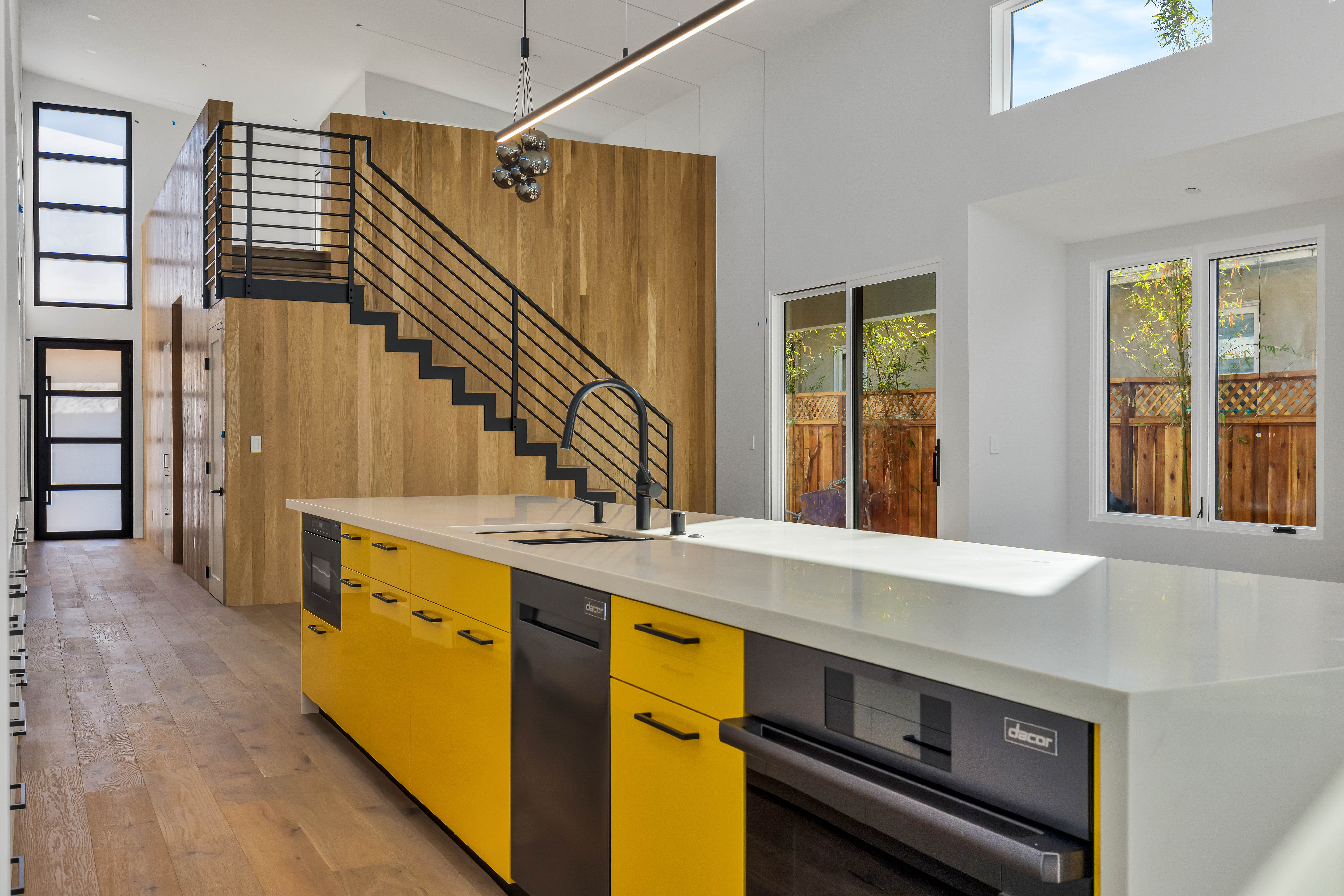 The centerpiece of the home is the modern kitchen, complete with sleek cabinetry, high-end appliances, and a striking yellow island that adds a bold pop of color to the clean, minimalist design. The kitchen flows effortlessly into the living and dining areas, making it perfect for entertaining guests or enjoying quiet family dinners.