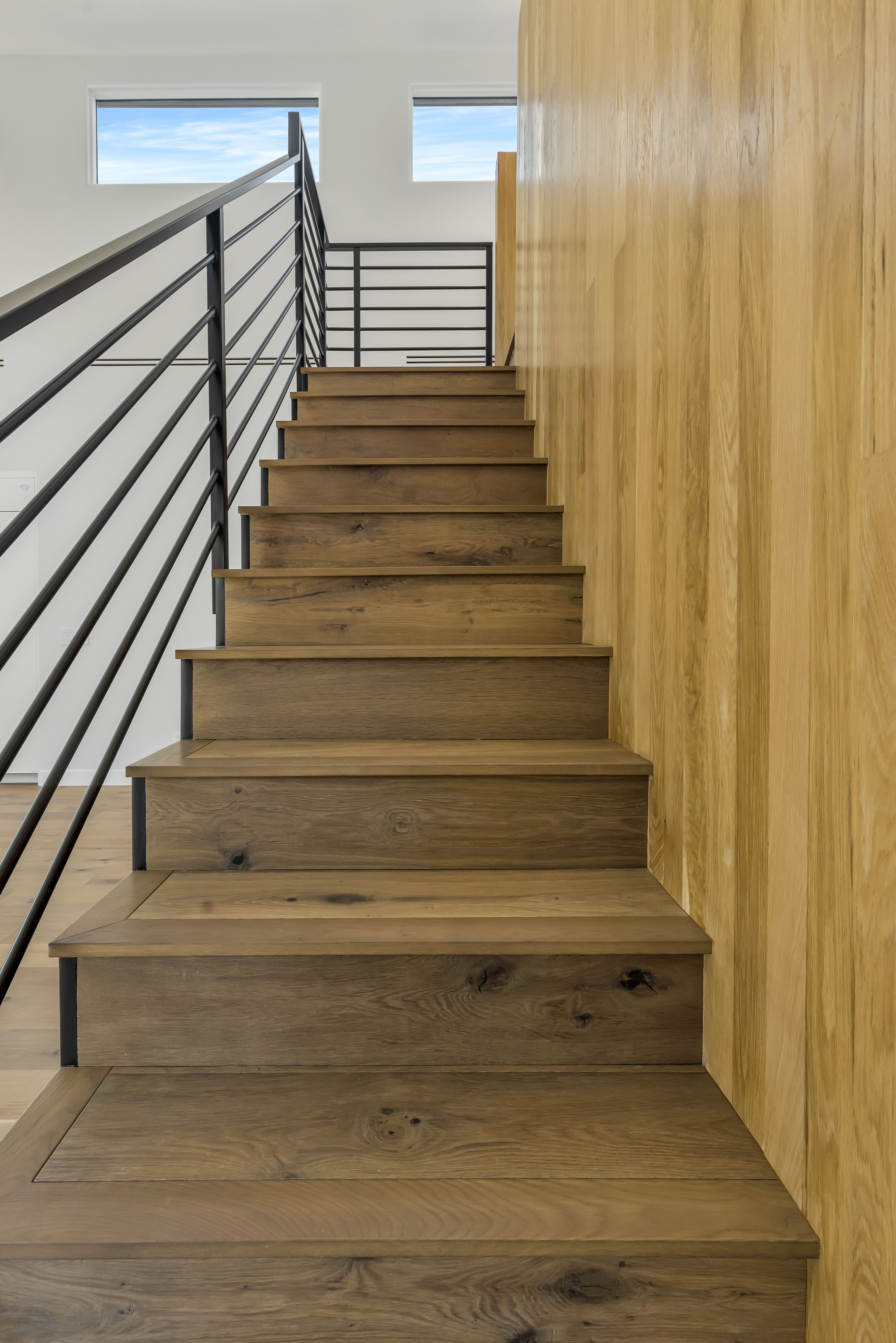 The home also boasts a unique blend of wood and metal accents, adding warmth and texture to the contemporary design. The custom staircase, with its sleek metal railing and wooden steps, is a standout feature that enhances the home’s modern aesthetic.