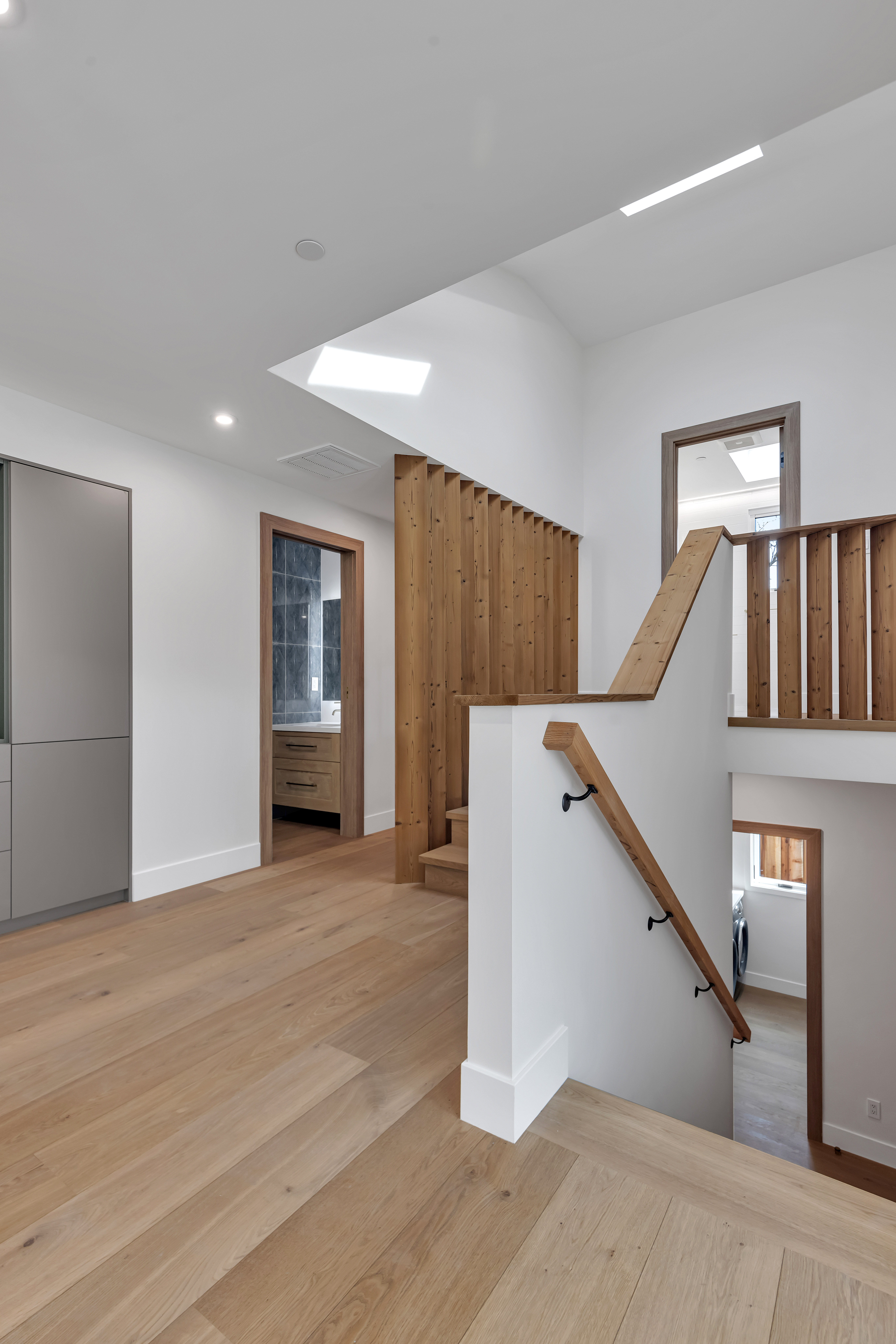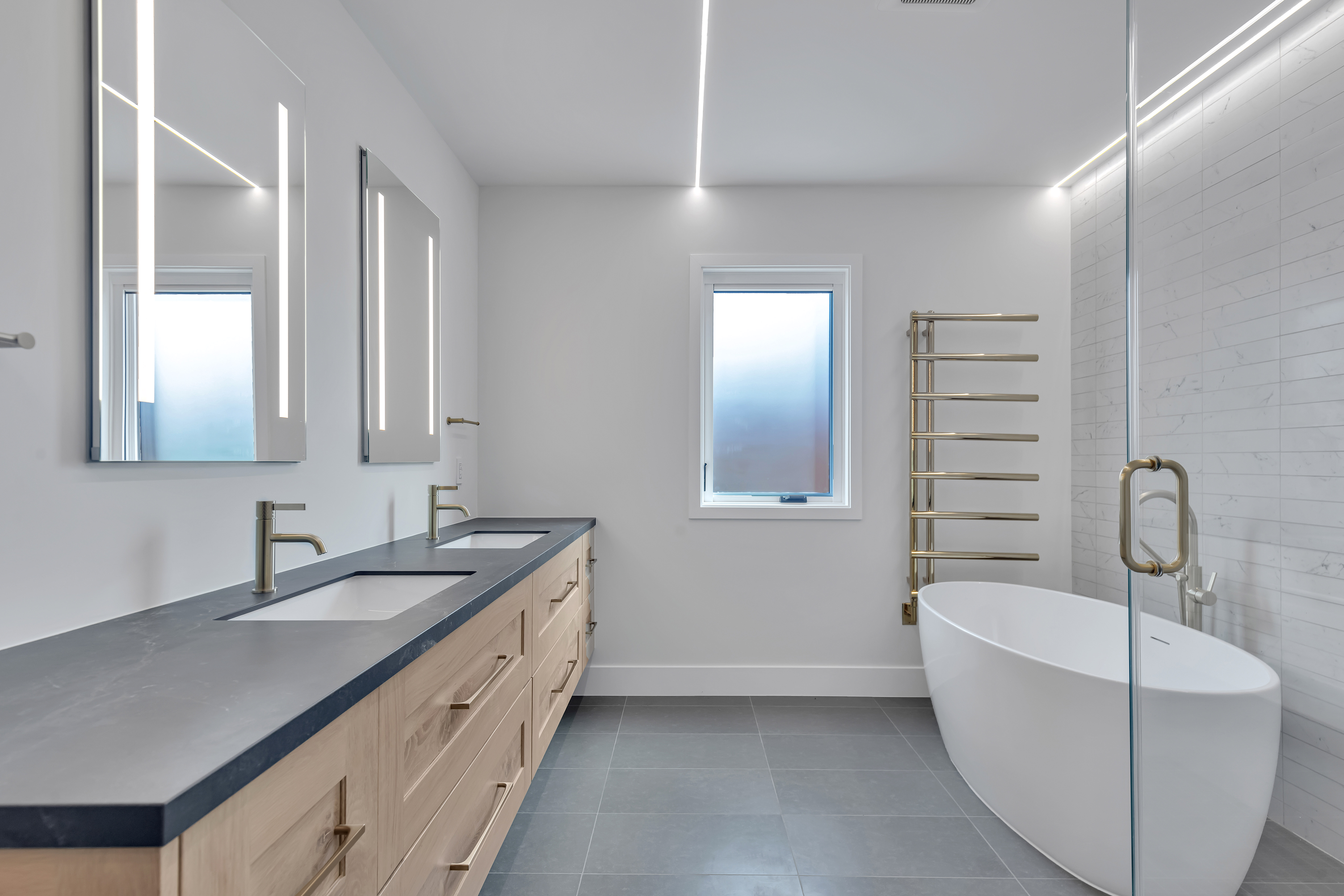 Both bathrooms feature floating vanities crafted in warm oak tones, paired with sleek brushed brass hardware and illuminated mirrors. One bathroom showcases a soft blue stacked tile for a spa-like feel, while the other balances contrast with a black stone backsplash.