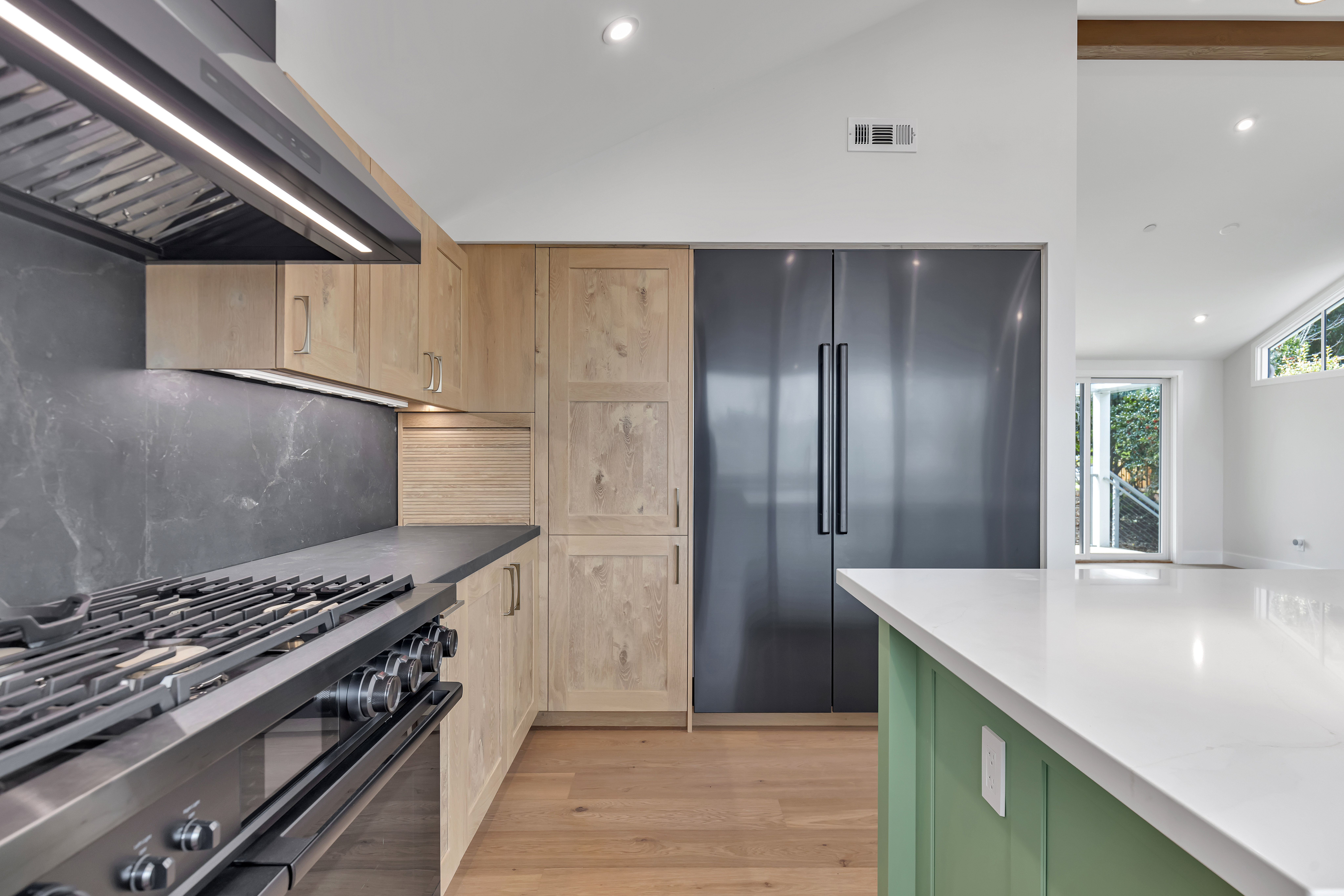 The heart of the home boasts a bold mint green island, paired with natural white oak cabinets and matte black stone countertops. Vaulted ceilings with exposed beams and large sliding doors invite daylight and create dramatic volume.