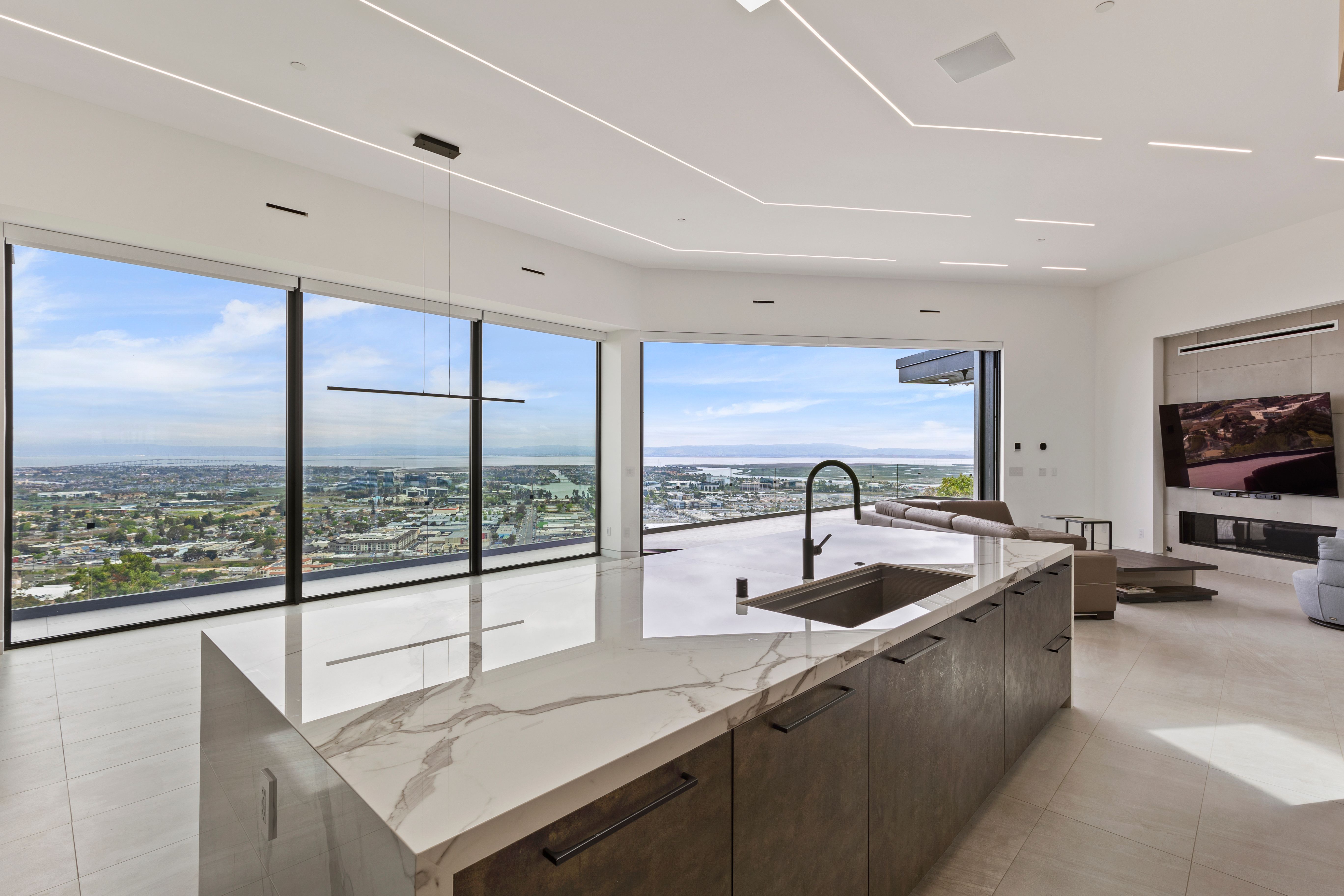 Massive glass walls and sliding pocket doors wrap the living space, capturing panoramic city and bay views and flooding the interior with natural light.