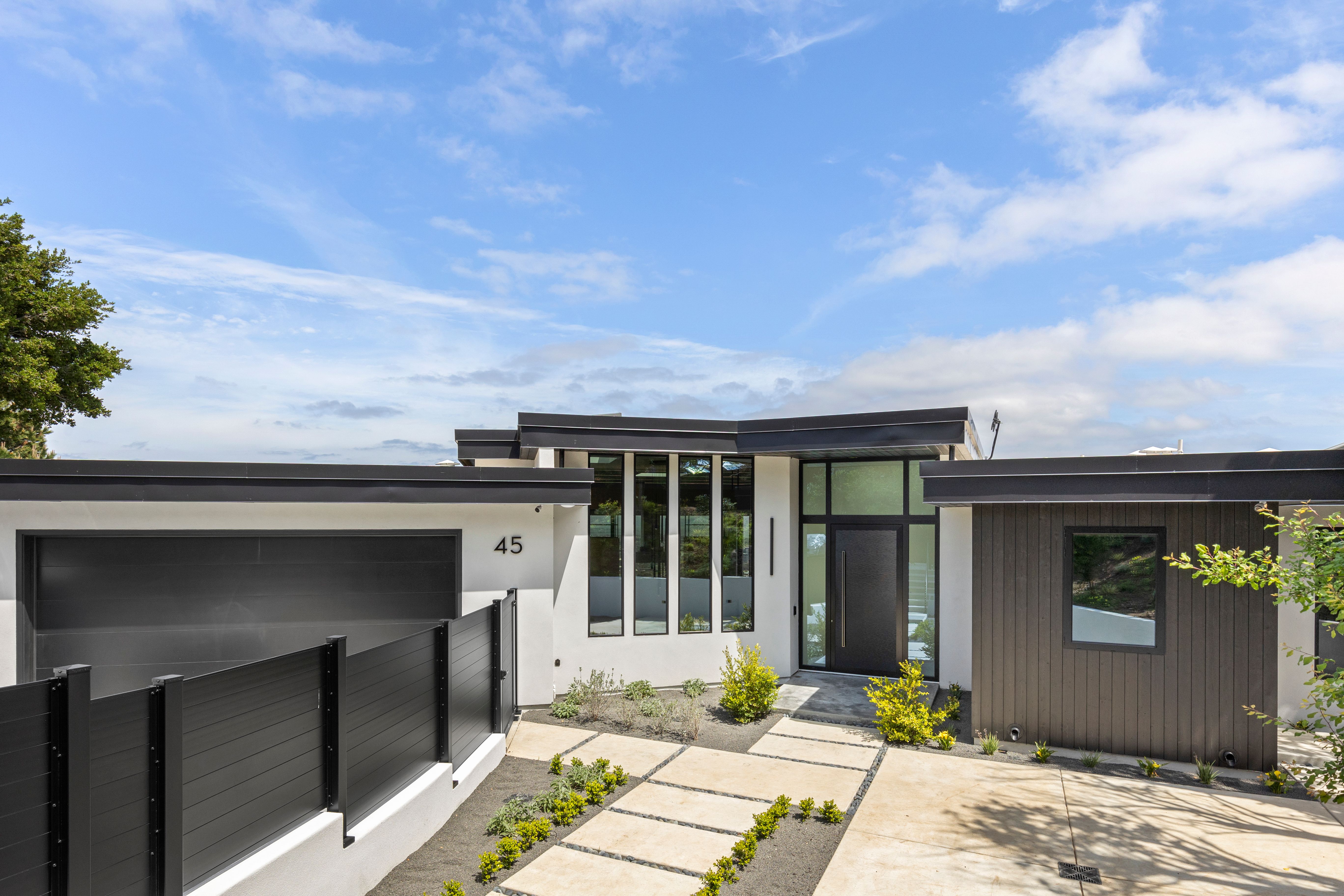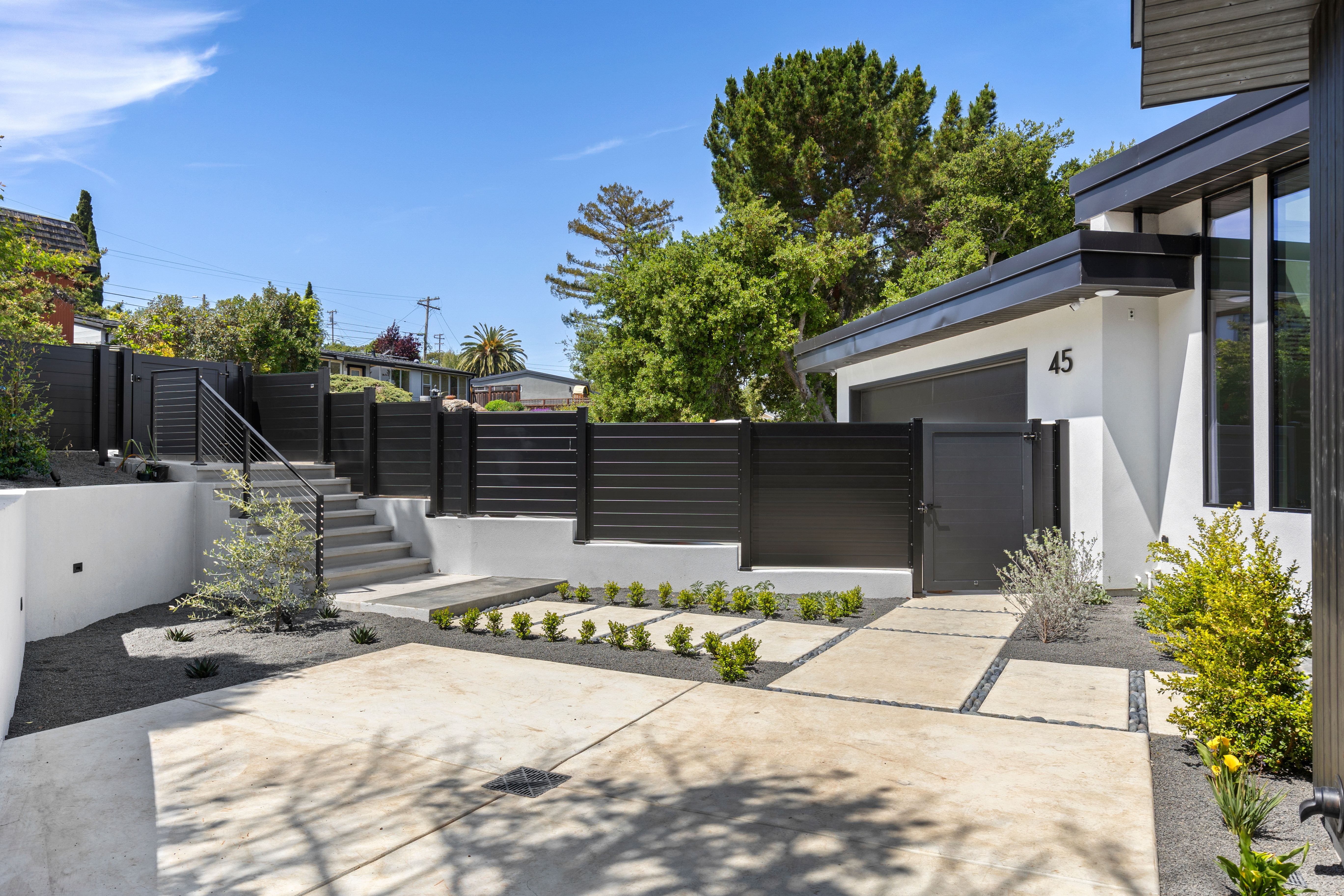 Tiered hardscaping, subtle planting, and black fencing were used to create a low-maintenance yet high-design exterior that mirrors the home’s modern language.