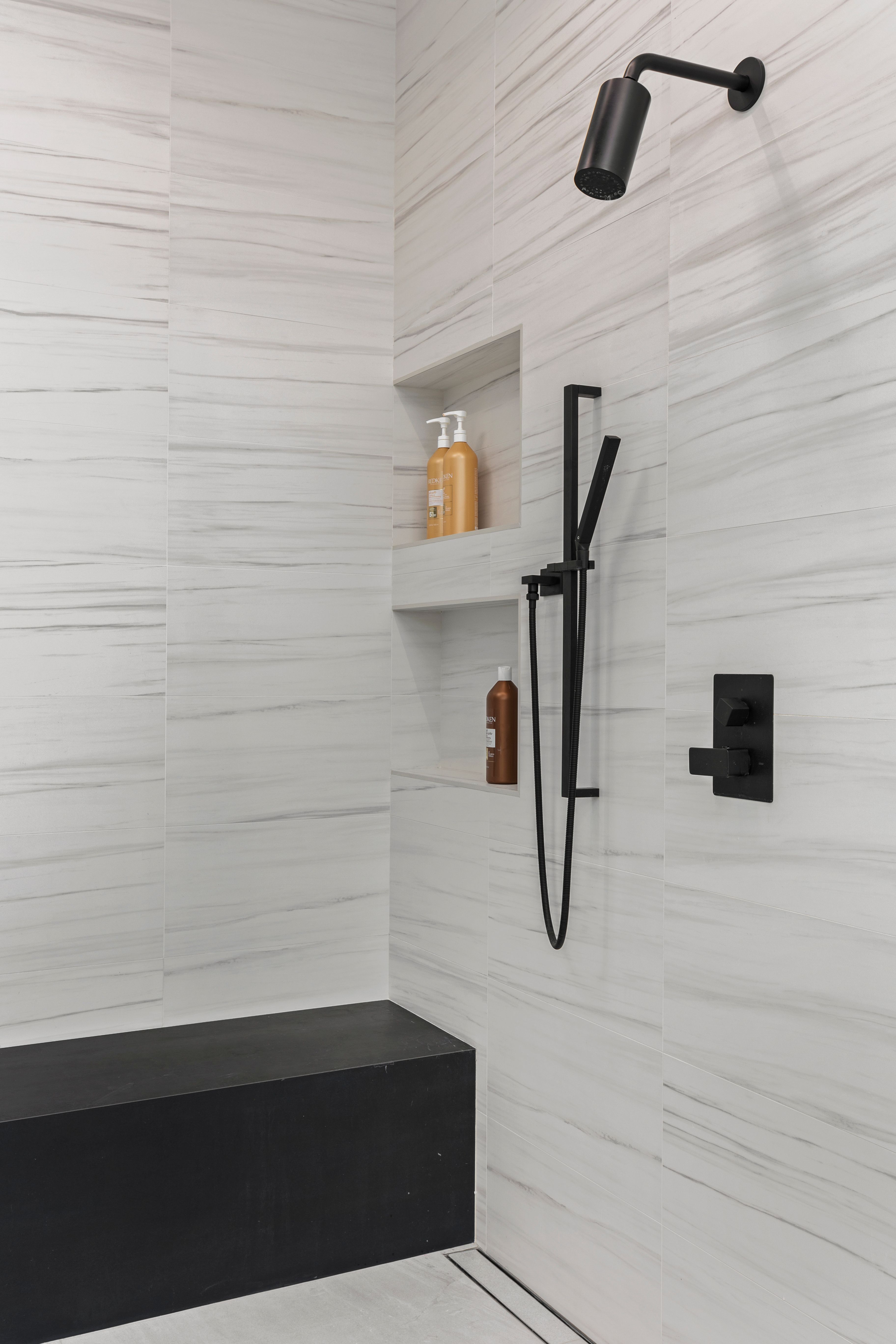 Porcelain, natural oak, matte black metal, and textured finishes were chosen for their visual contrast and durability—creating a palette that feels high-end yet restrained.