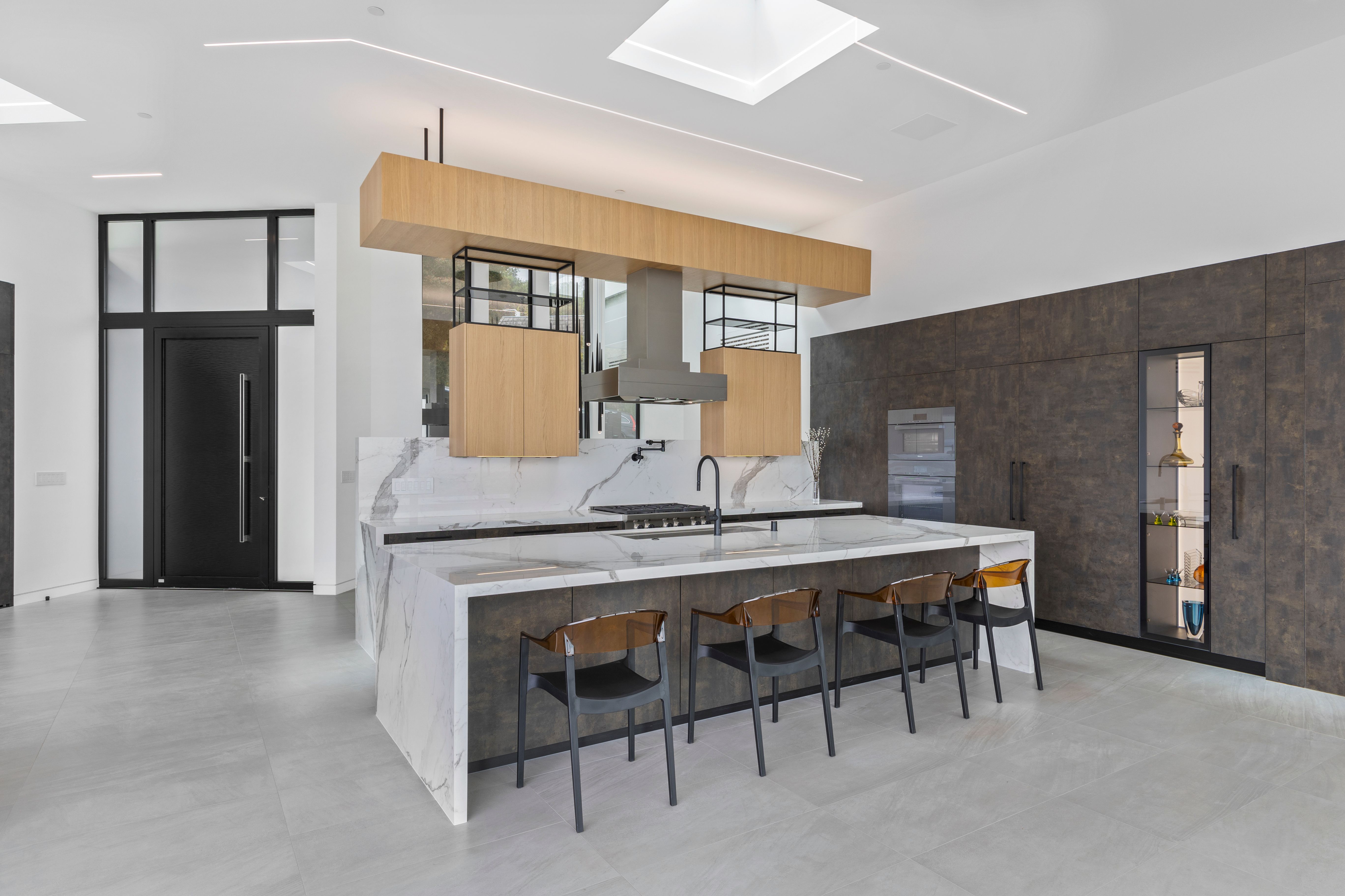 The kitchen is a focal point of the space, with sculptural bookmatched porcelain slabs wrapping the island and backsplash. Custom cabinetry in rich, textured matte finishes pairs with light oak accents and suspended shelving to deliver a high-functioning design with gallery-like presence. Integrated appliances and clean black fixtures reinforce the home’s precise, contemporary language.