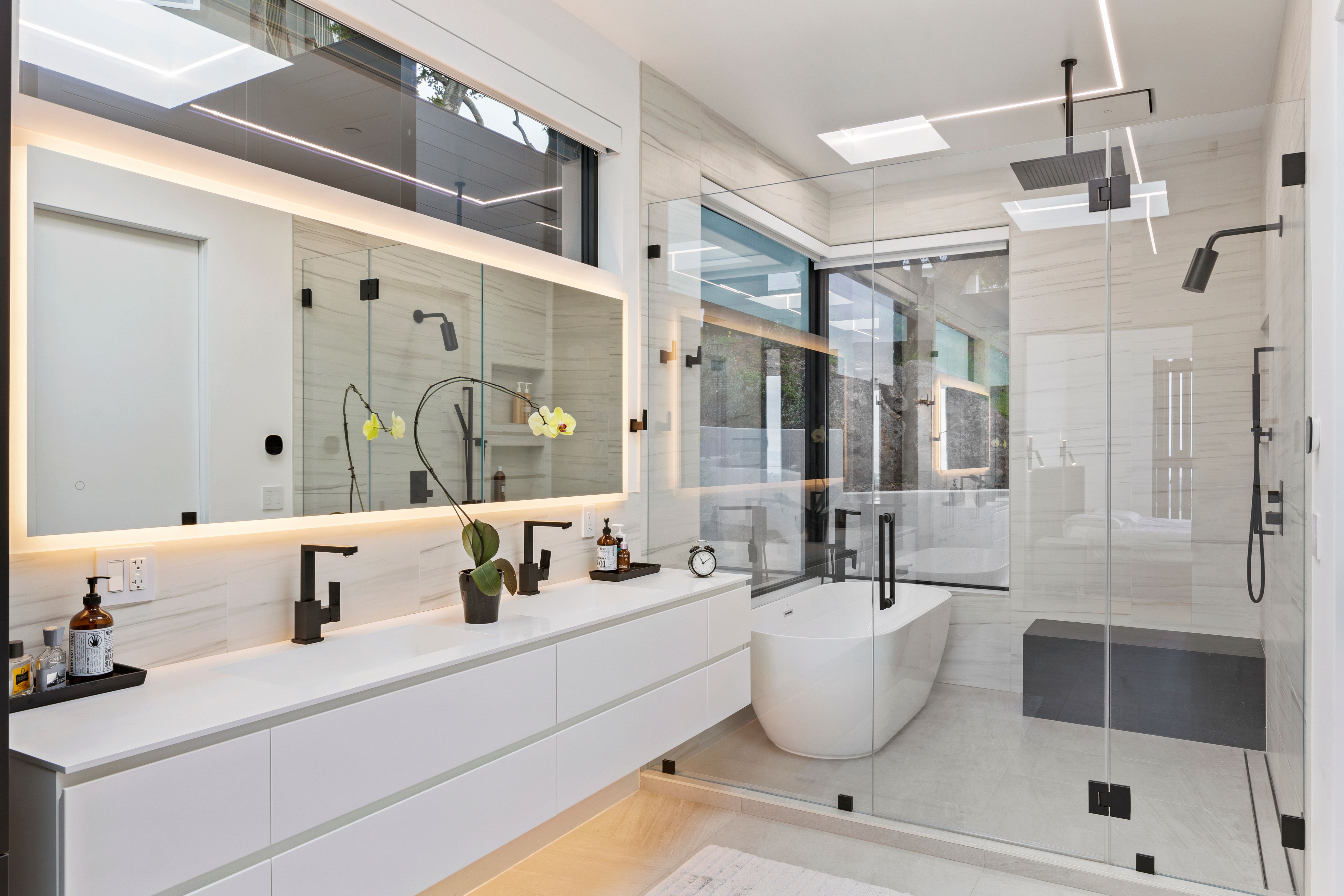 Floating vanities, frameless glass, and ambient lighting transform the powder room and primary bath into immersive experiences, styled for maximum impact.